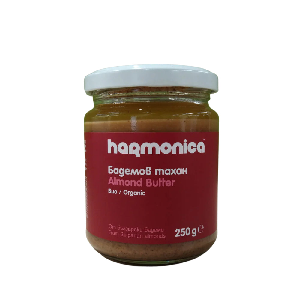 Harmonica almond butter is super buttery with a rich nutty flavour. That makes it an excellent ingredient for raw or baked desserts and candies, as well as for all kinds of baked dishes, salads or breakfast meals. You can spread it on toast or indulge with it straight from the jar. Mix it up with honey and cocoa, and you get the perfect home-made chocolate! Product origin: Bulgaria