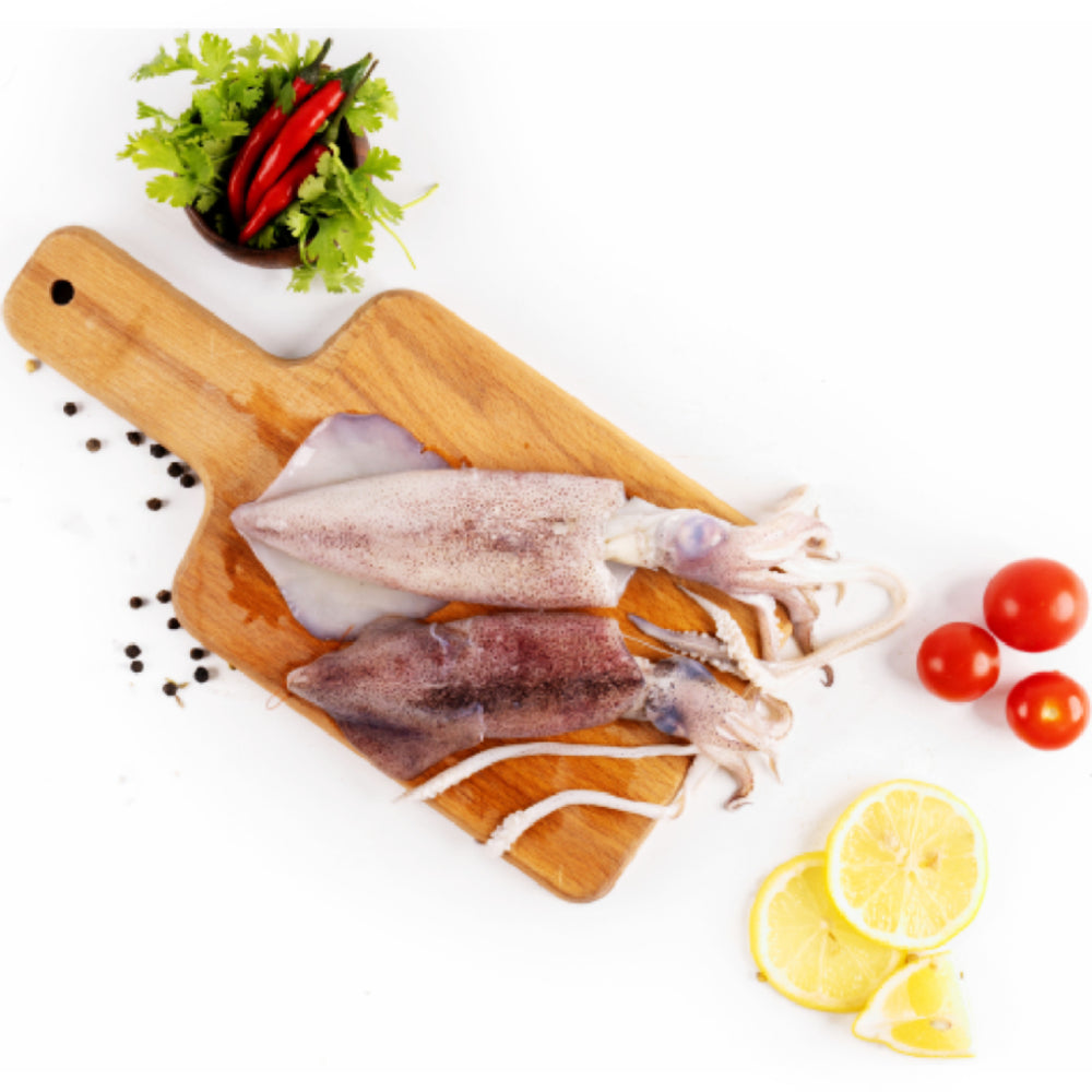 Whole Calamari (Wild Catch) - UAE - 500g. Fresh whole wild-caught calamari from UAE waters, offered with flexible cleaning and cutting options to suit your cooking style. Perfect for grilling, frying, or stuffing. Naturally high in protein and low in fat for a healthy seafood choice. Key Features: - Wild-caught calamari from UAE, with customizable cleaning and cutting options. - High-protein, low-fat seafood supporting lean diets and muscle health. - Rich in vitamin B12, selenium, and essential minerals. - Ideal for grilling whole, stuffing, or preparing fresh calamari rings. - Responsibly sourced and chilled to ensure maximum freshness and flavor.