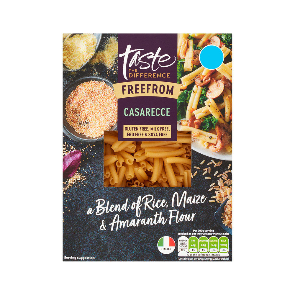 Dried casarecce pasta made from rice, maize and amaranth flours. A Blend of Rice, Maize & Amaranth Flour . Our Taste the Difference Free From pasta contains a unique blend of grains to give a well-rounded, balanced flavour that's the perfect carrier for a variety of delicious sauces. We've worked with Italian experts to achieve a pasta that matches the texture and "al dente" bite of high-quality durum wheat pasta, ensuring there is no compromise on quality for those following a Free From lifestyle. That's why you can taste the difference Serving suggestion: Delicious served with mixed oyster mushrooms, kale and toasted pine nuts. Free From Gluten, Soya, Milk and Egg. Product origin: Italy