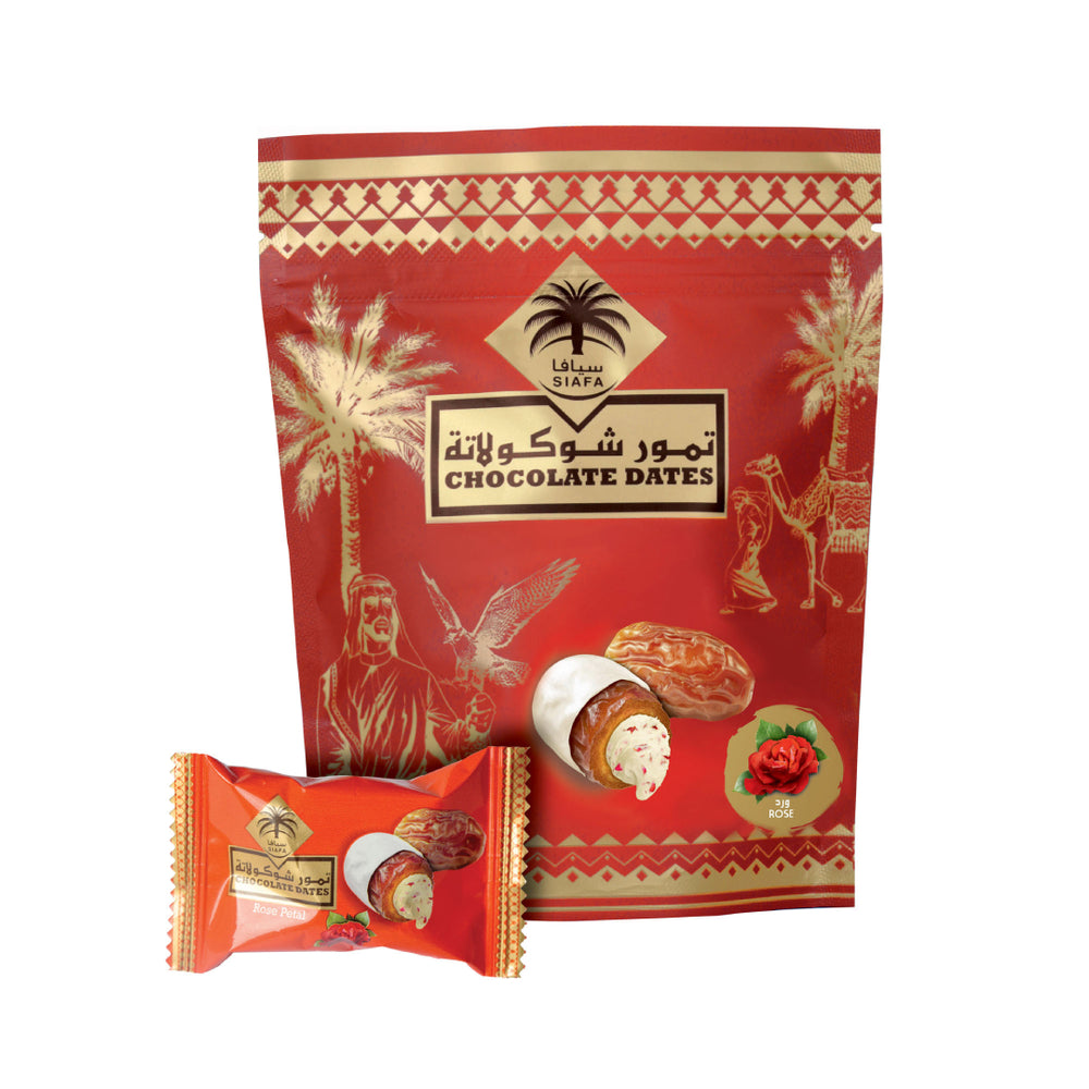 Flavoured Dates (Rose) – Saudi Arabia – 100g Premium Saudi dates infused with natural rose petals and delicately coated in white chocolate, offering a luxurious blend of floral aroma and rich sweetness in every bite. Key Features: -Made with high-quality dates rich in potassium and dietary fiber for heart and digestive health. -Infused with edible rose petals for a unique, aromatic flavor experience. -Coated in smooth white chocolate for a balanced, indulgent treat. -Naturally sweet and free from artificial preservatives - perfect for mindful snacking. -Conveniently packed in resealable bags to preserve freshness and flavor.