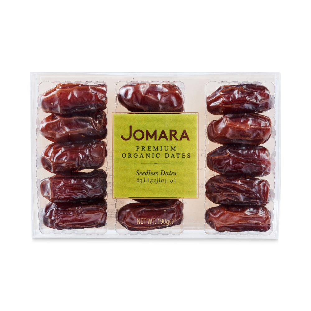 Jomara Seedless Dates – Saudi Arabia – 190g. Enjoy the pure, unadulterated sweetness of organic Seedless Dates from Saudi Arabia. These naturally soft and chewy dates offer ultimate convenience, making them an ideal, fuss-free snack, baking ingredient, or healthy natural sweetener for any time of day. Key Features: -Certified organic quality: Savor organic Saudi dates, grown without harmful chemicals for pure, wholesome taste. -Ultimate snacking convenience: Offers effortless enjoyment, perfect for quick grab-and-go healthy snacks and cooking. -Natural sweetness & energy: A naturally sweet energy-boosting snack, providing sustained vitality from natural sugars and fiber. -Rich in dietary fiber: Supports healthy digestion and gut health, contributing to overall well-being. -Versatile & easy to use: Ideal for organic baking, smoothies, energy balls, or as a natural alternative to refined sugar without the fuss of pits.