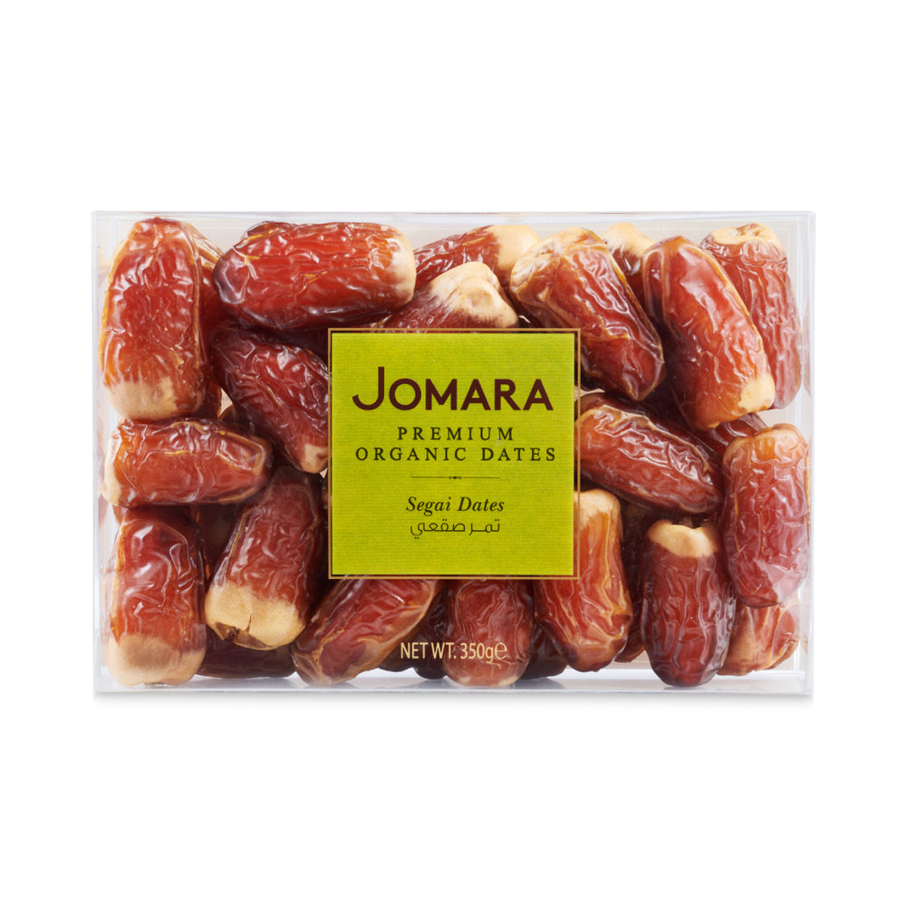Jomara Organic Segai Dates - Saudi Arabia - 350g Segai dates are renowned for their two-tone appearance and contrasting textures—firm at the top and soft at the base. This 350g pack of organically grown dates offers a balanced taste that’s both mildly sweet and slightly dry. Key Features: - Organically farmed Segai variety from Saudi Arabia - Unique dual-textured bite: crunchy top, soft base - Great source of energy, fibre, and essential minerals - Convenient 350g resealable pack - Grown using sustainable and traditional farming practices