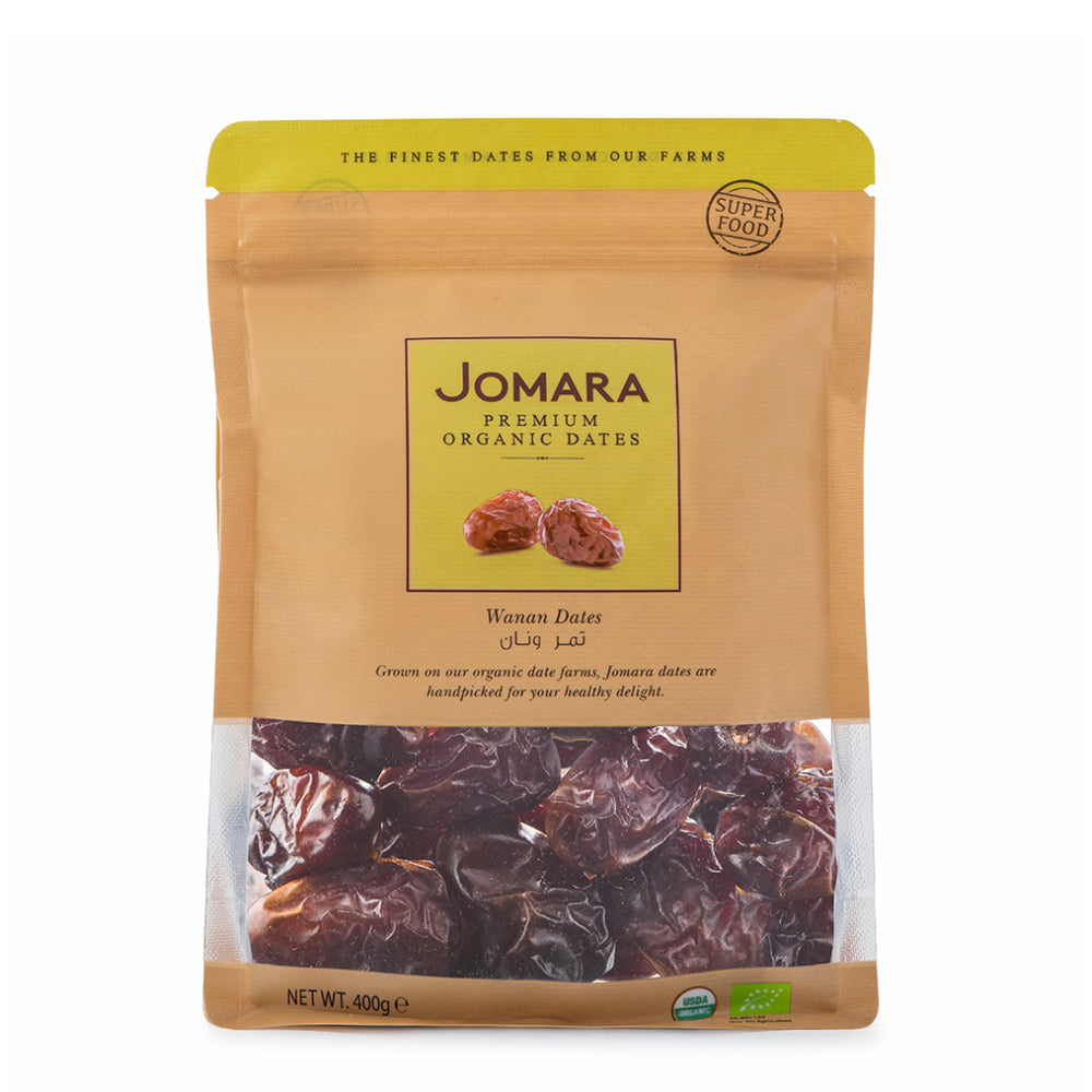 Jomara Organic Wanan Dates - Saudi Arabia - 700g Wanan dates are an exclusive Saudi variety with a long, wrinkled profile and rich sweetness. These organic dates are satisfying, deeply flavourful, and ideal for both gifting and daily snacking. Key Features: - Exclusive long-cone shaped Saudi date - Soft, dark skin with sweet, rich flesh - Zero cholesterol and high in essential minerals - Packaged in resealable format for freshness